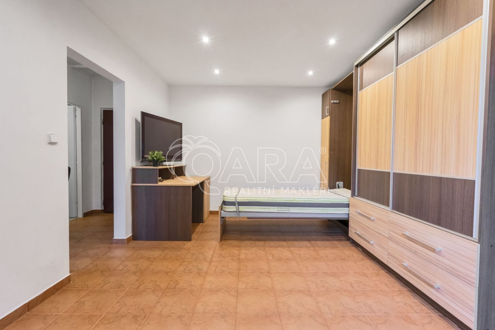 Bytová jednotka prošla kompletní rekonstrukcí, v pokoji jsou na míru zhotovené skříně se zabudovanými sklopnými lůžky a ve stejném stylu i pracovní stůl.